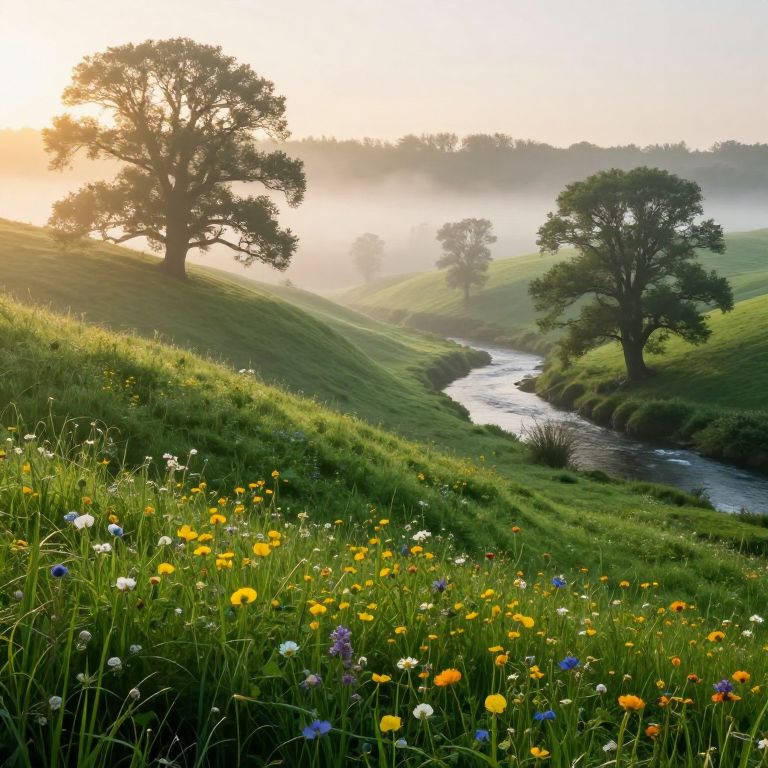 Verdoro landscape at dawn, rolling green hills covered in mist, vibrant wildflowers blooming, soft golden sunlight filtering through ancient trees, a serene river flowing gently, fantasy atmosphere, highly detailed, ethereal colors