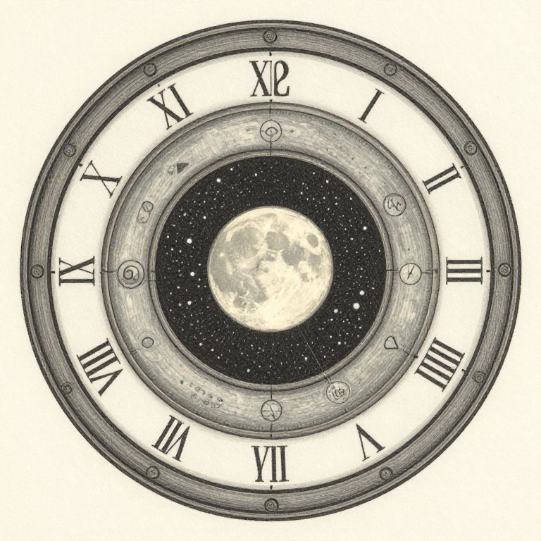 A hand-drawn, lithograph-style illustration with desaturated colors, featuring a wheel of time in the style of Odilon Redon, depicting a celestial scene with a central moon and surrounding layers of time.