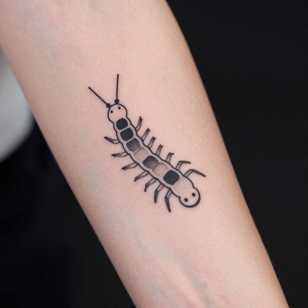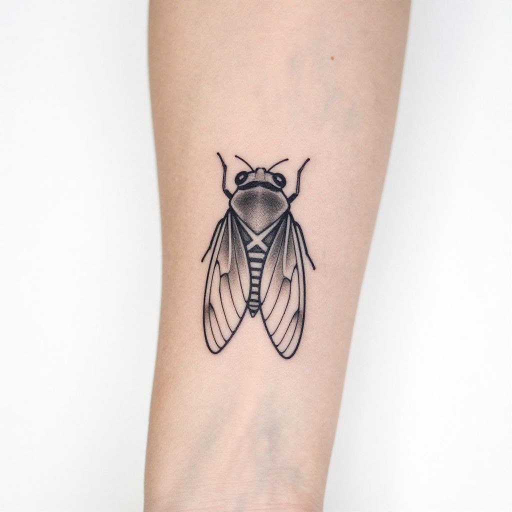 Elegant minimalist cicada tattoo with thin black outlines and negative space detailing, small size on wrist, stylized wings resembling fine lace, soft contrast, contemporary ink art, minimalistic composition.