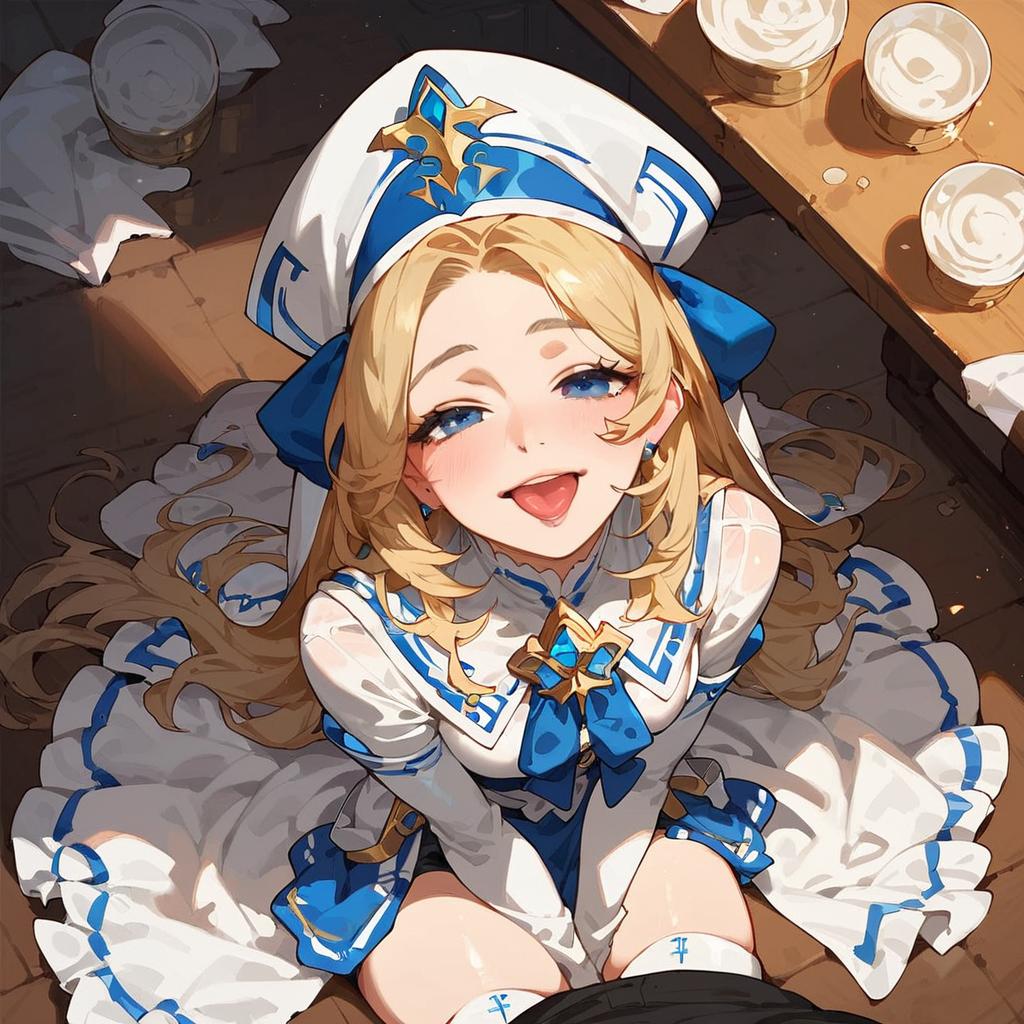 Score_9, score_8_up, score_7_up, score_6_up, a drunk girl sitting on a table, open mouth, smile, half-closed eyes, from above, looking at viewer, (hatching \(texture\), priestess, blue eyes, long hair, blonde hair, white headwear, white dress, frilled sleeves, blue pelvic curtain, (black shorts:0.9), thighhighs, white boots, priestess-shirt