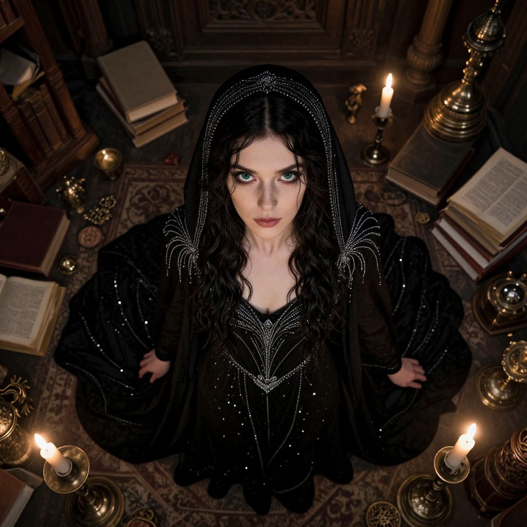 A mesmerizing portrait of a contemporary sorceress captures the enigmatic charm of Edward Gorey-inspired illustrations, depicting a compelling woman draped in a flowing black robe intricately embellished with silver thread that sparkles under the soft glow of candles. Her penetrating green eyes convey an aura of ancient knowledge as she locks her gaze with the viewer from an unconventional overhead viewpoint, her face partially concealed by the dark silhouette of her cascading tresses. Set against the backdrop of a dimly lit, cluttered study teeming with aged tomes and arcane relics, this scene exudes an air of intrigue and unease, beckoning the observer into its hauntingly captivating realm.