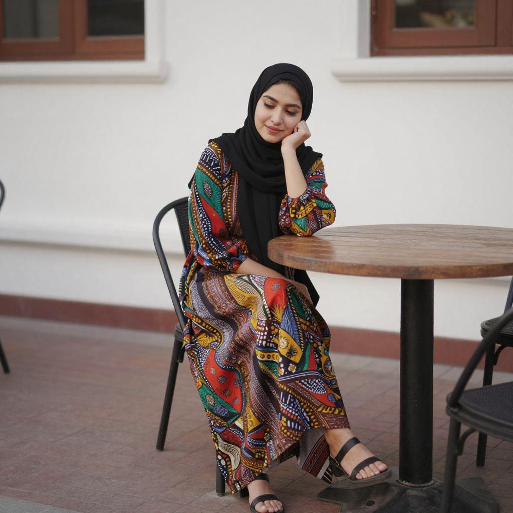Photograph of a woman with fair skin and black hair, wearing a long, colorful, patterned dress and black hijab, sitting on a black chair at a round wooden table. She rests her head on her hand, smiling slightly. She wears black sandals and is seated on a brick-paved patio with a white building wall in the background.