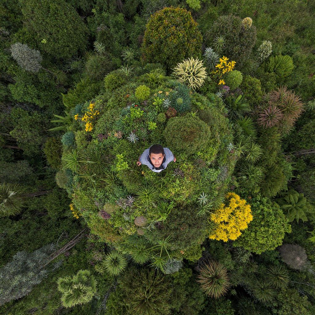 Aerial photograph of a man with short black hair, wearing a white shirt, surrounded by dense, colorful forest foliage from above.
