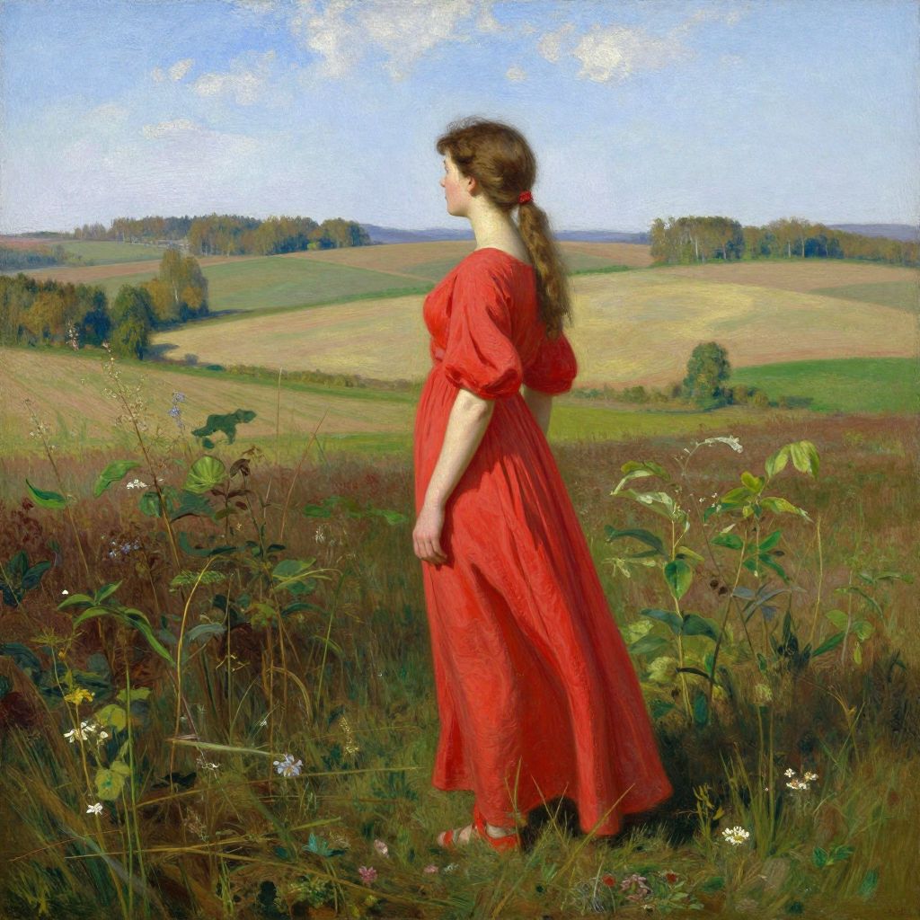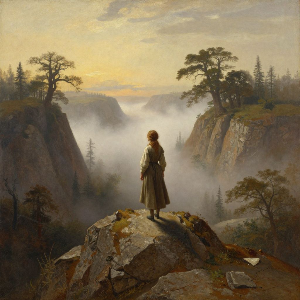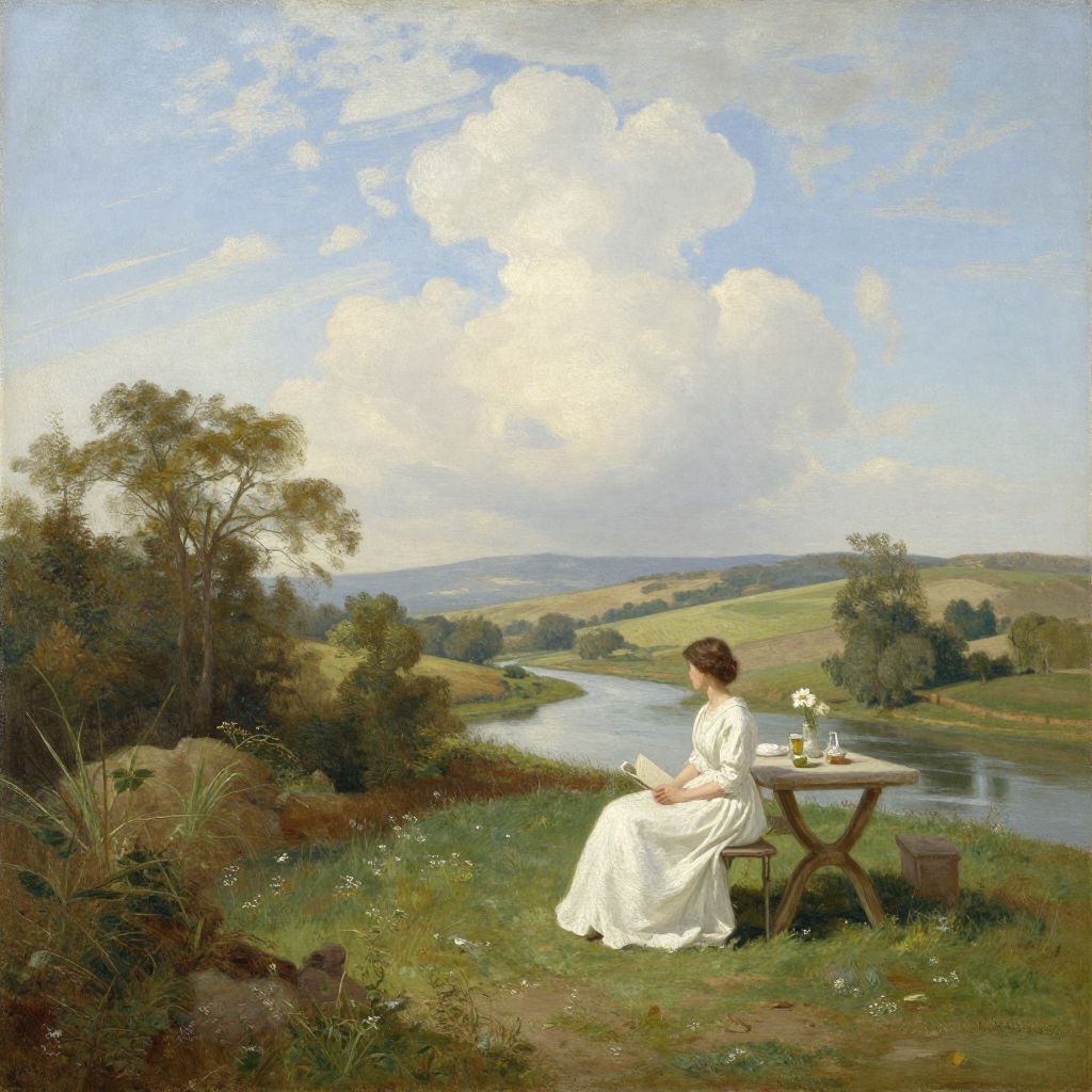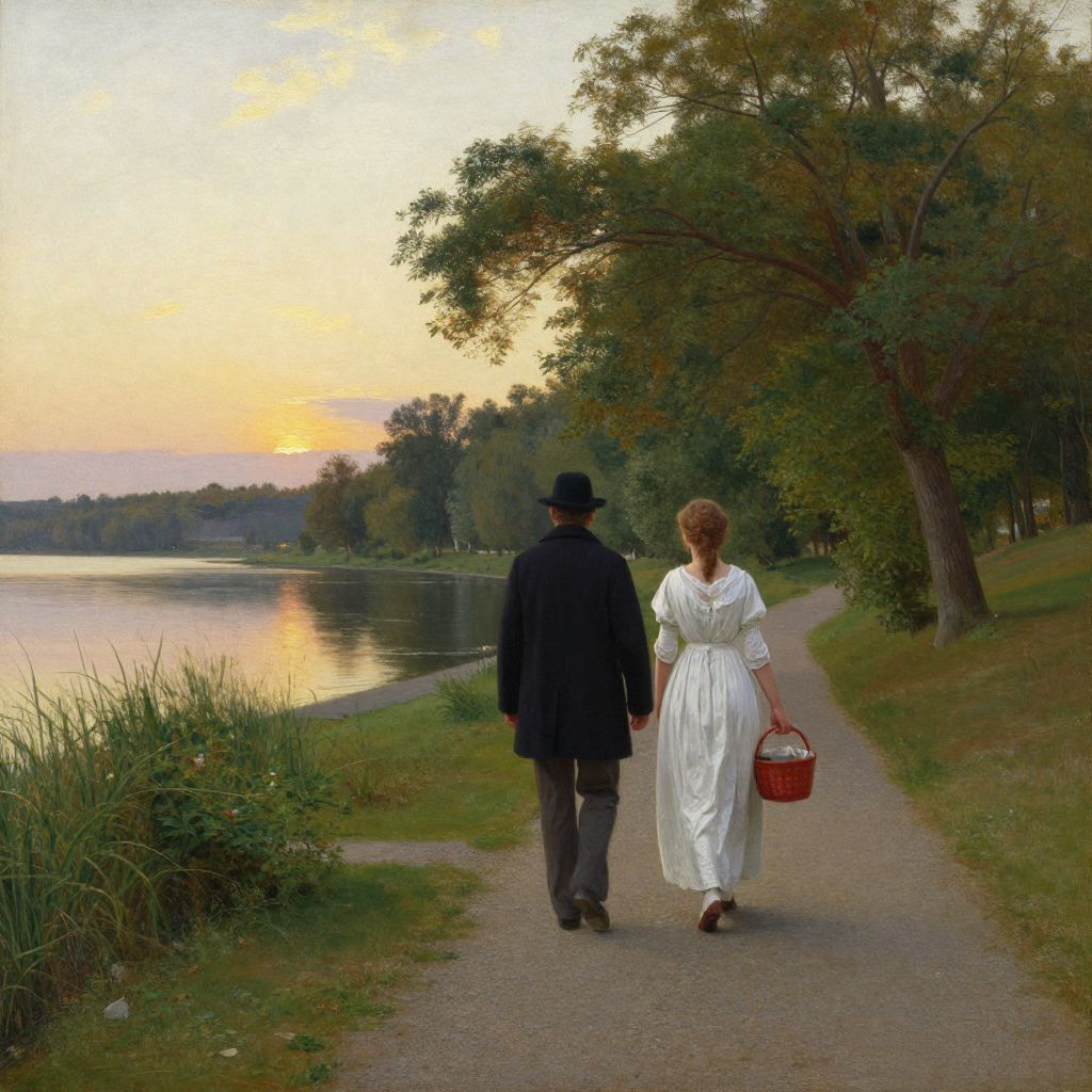A serene oil painting captures a tranquil lakeside scene where two figures, a man in a dark coat and hat and a woman in a white dress carrying a red basket, stroll along a path lined with lush greenery under a soft, golden-hour sky, evoking the romantic realism of Thomas Cole's style.