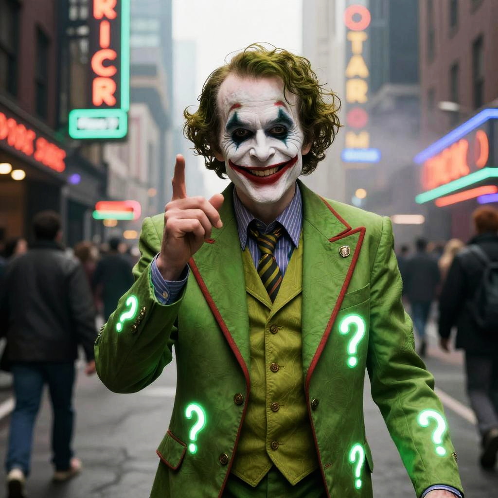 Robin Williams portraying the Riddler with quirky charm, intricate green suit adorned with glowing question marks, chaotic Gotham street scene, vibrant neon lights and fog