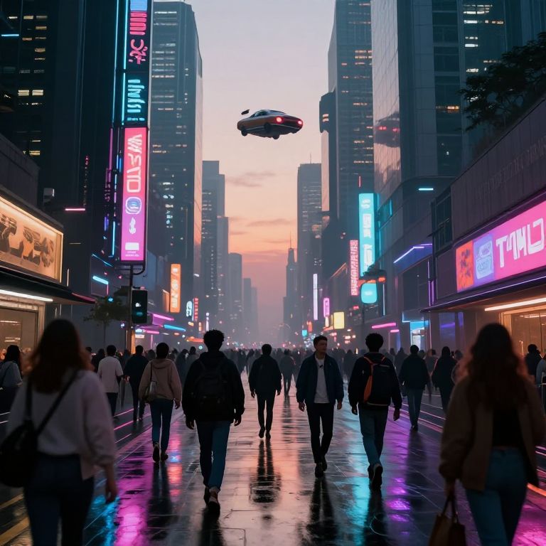Photograph of a bustling neon-lit city street at dusk, with a flying car above, crowded pedestrians, and colorful vertical signs.