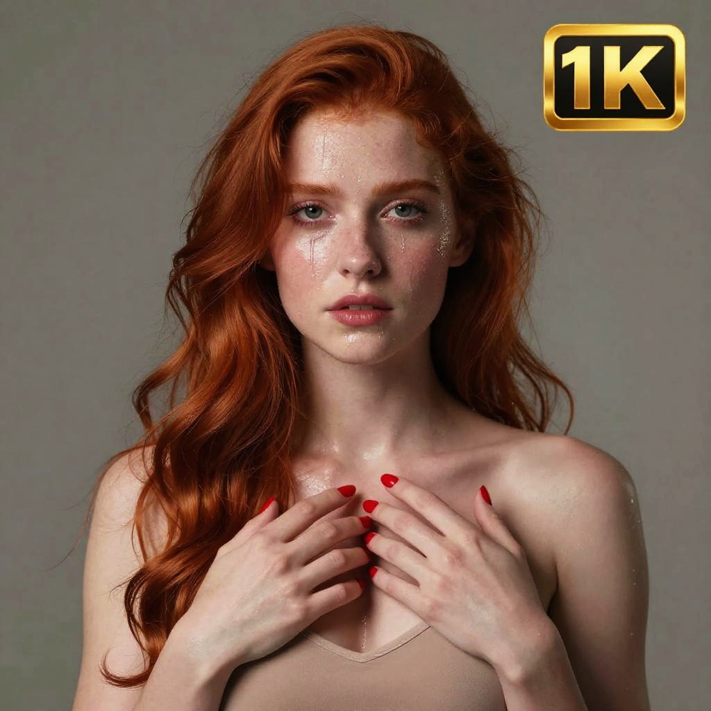 RAW photograph, best quality, masterpiece, an extremely delicate and beautiful, extremely detailed, CG, unity, 8k wallpaper, Amazing detailed, finely detailed, official art, extremely detailed CG unity 8k wallpaper, ultra-detailed, highres, clear, focused, (best quality), (realistic, photo-realistic:1.6), 8k, soft lighting, high quality, cinematic lighting, 1girl, centered, full body, redhead, red hair, (sweat:1), perfect fingers, red nails, long hair
