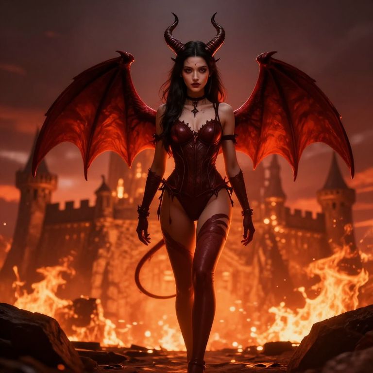 A serene figure adorned with vibrant red hair and dark horns stands amidst a lush, fantastical wreath of greenery and blooming flowers, bathed in the radiant glow of a celestial sun, defying the boundaries between nature and mythology.