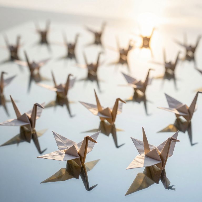 An army of origami cranes folded from sunlight storms across a mirror-world, their wings warping reflection into reality.