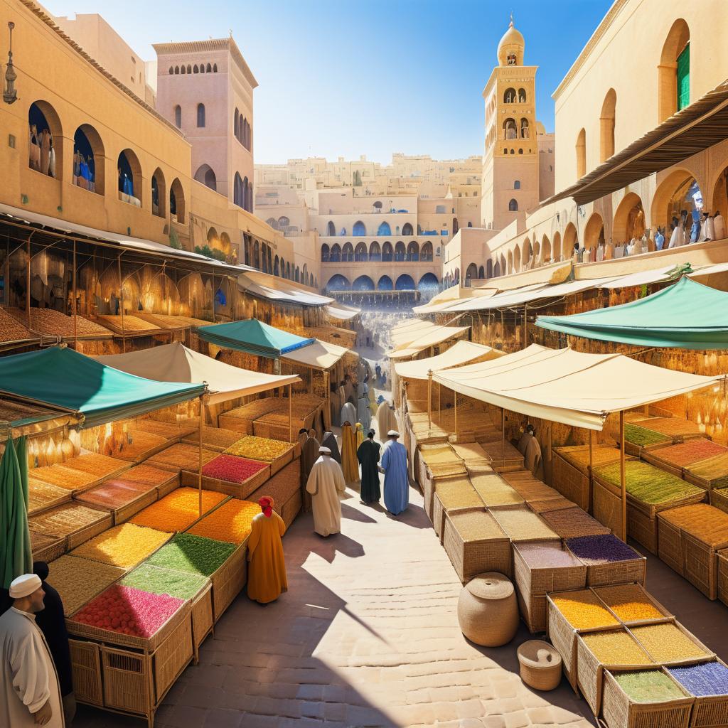 Ultra-wide cutaway view of a vibrant bustling Moroccan market, bright daylight, cinematic lighting, watercolored pencil and ink by Claude Monet, Gustav Klimt, Vincent van Gogh, mystical and serene atmosphere