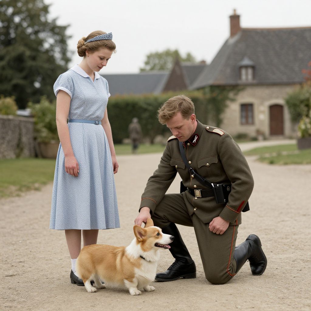 Ultra wide 1946 historical photo of a single german general kneeling to pet a cute corgi, a young queen elizabeth stands near him, french village exterior, highly detailed, sharp focus