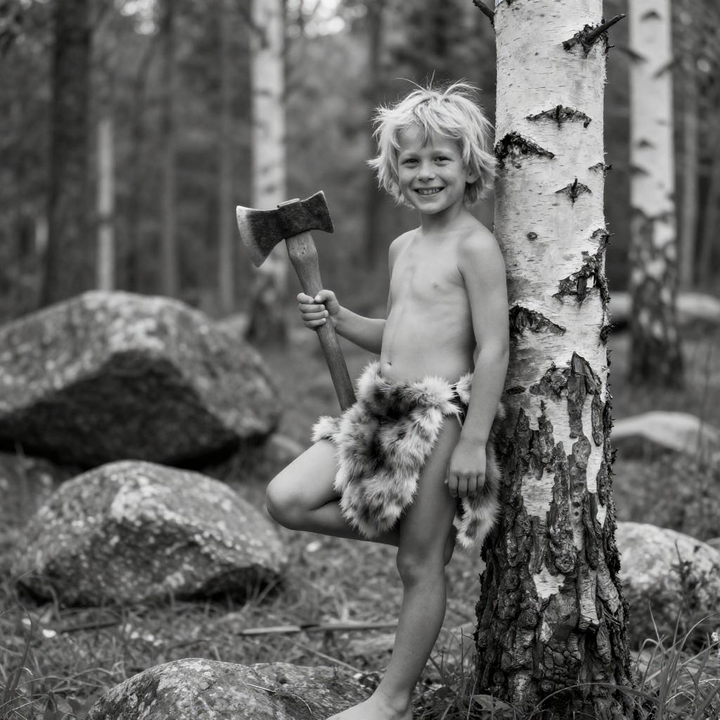 Black-and-white photograph of a young boy with messy blonde hair, wearing a fur loincloth, standing on one leg, leaning against a birch tree. He smiles widely. Forest background with rocks and tall trees. He holds a small axe.
