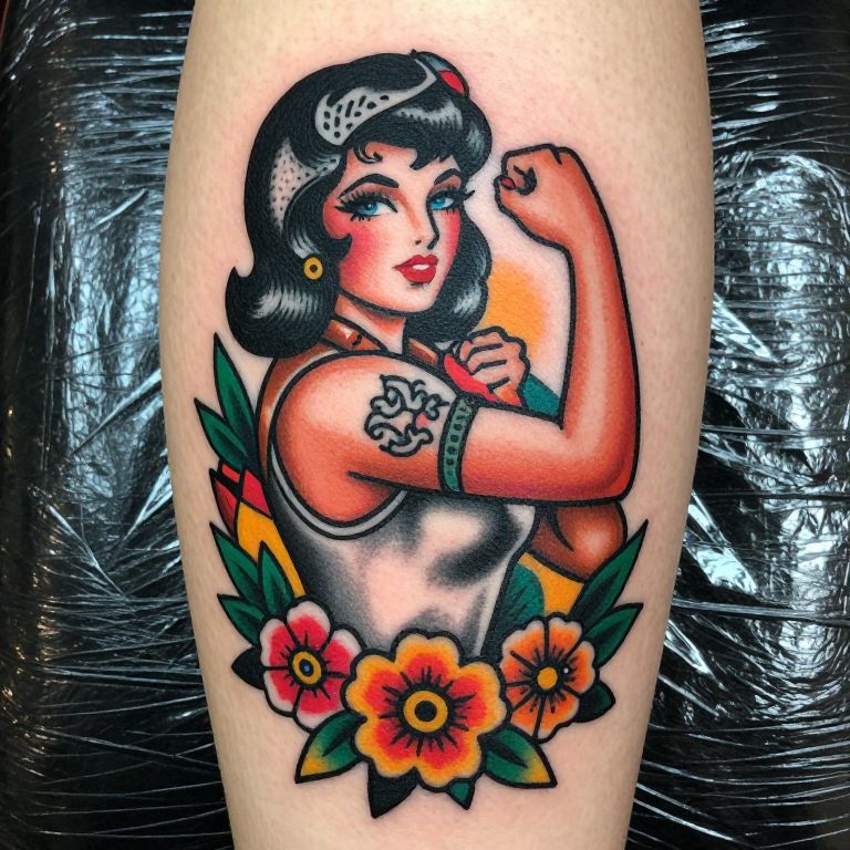 A vibrant, classic tattoo of a pin-up girl with short black hair and blue eyes flexing her right arm. She's wearing a white tank top and a brown leather vest, with colorful floral elements and leaves surrounding her. Her arms have intricate tattoo sleeves. The tattoo is on light skin, with a black, textured background that looks like plastic wrap.