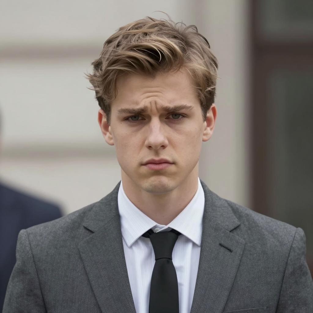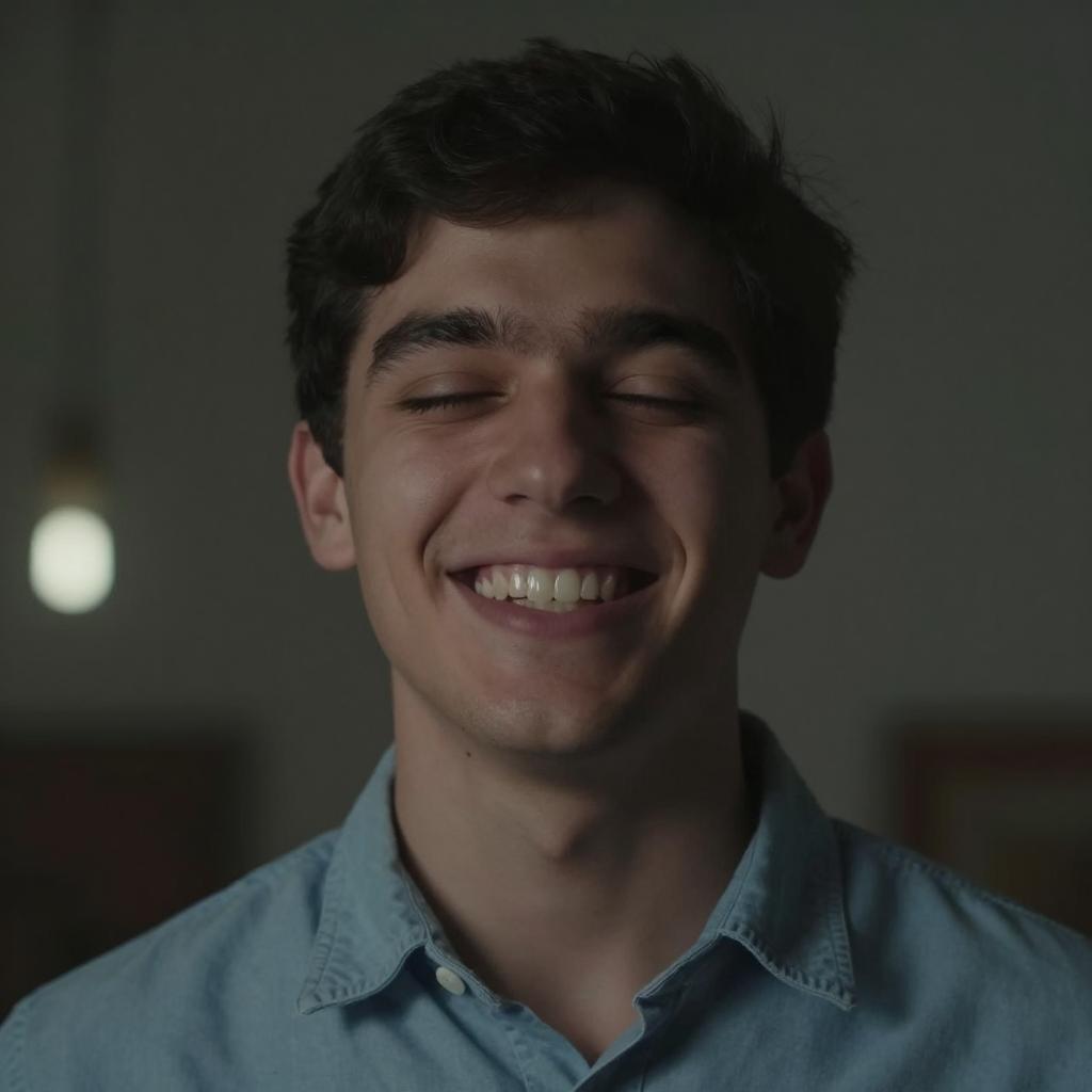 A young man with curly brown hair, light skin, and blue eyes. He wears a blue shirt and looks slightly to the right with a neutral expression. Blurred background includes a dark wooden wall and patterned wallpaper.