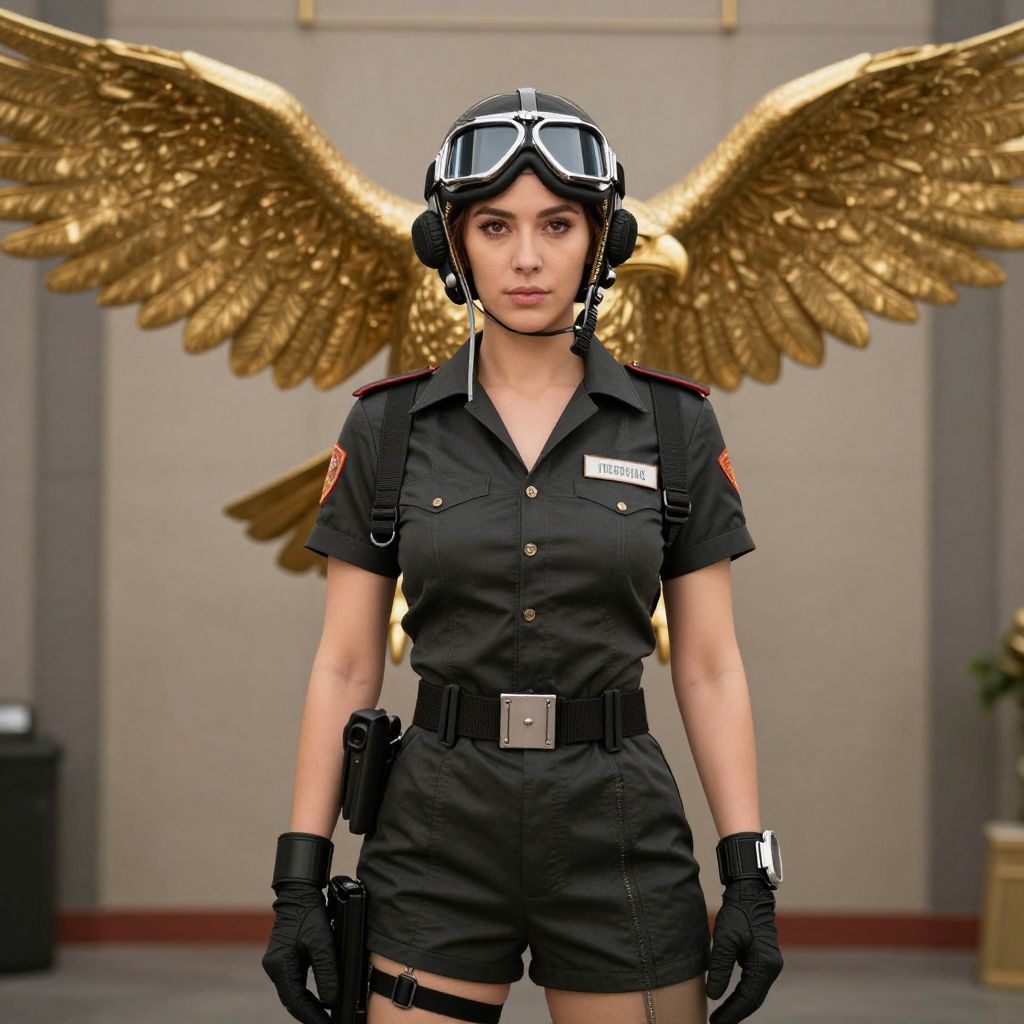 Digital art of an Asian woman with golden wings, wearing a black pilot uniform, aviator helmet, and gloves, standing confidently.