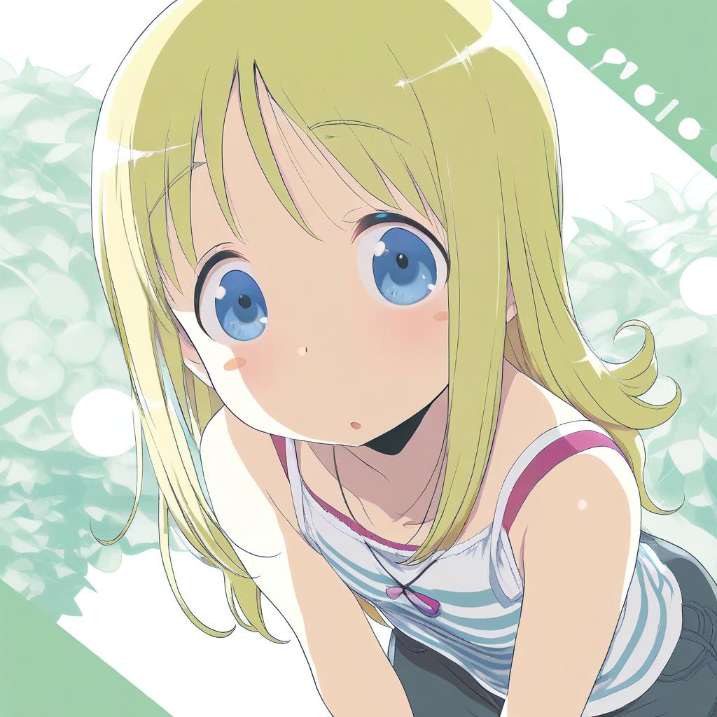 Anime-style illustration of a girl with long blonde hair and large blue eyes. She wears a striped white and blue tank top with a pink bow detail and dark pants. The artwork features soft pastel colors and a light background with abstract leafy patterns, inspired by ichigo mashimaro style and the artist Makoto Daikichi.