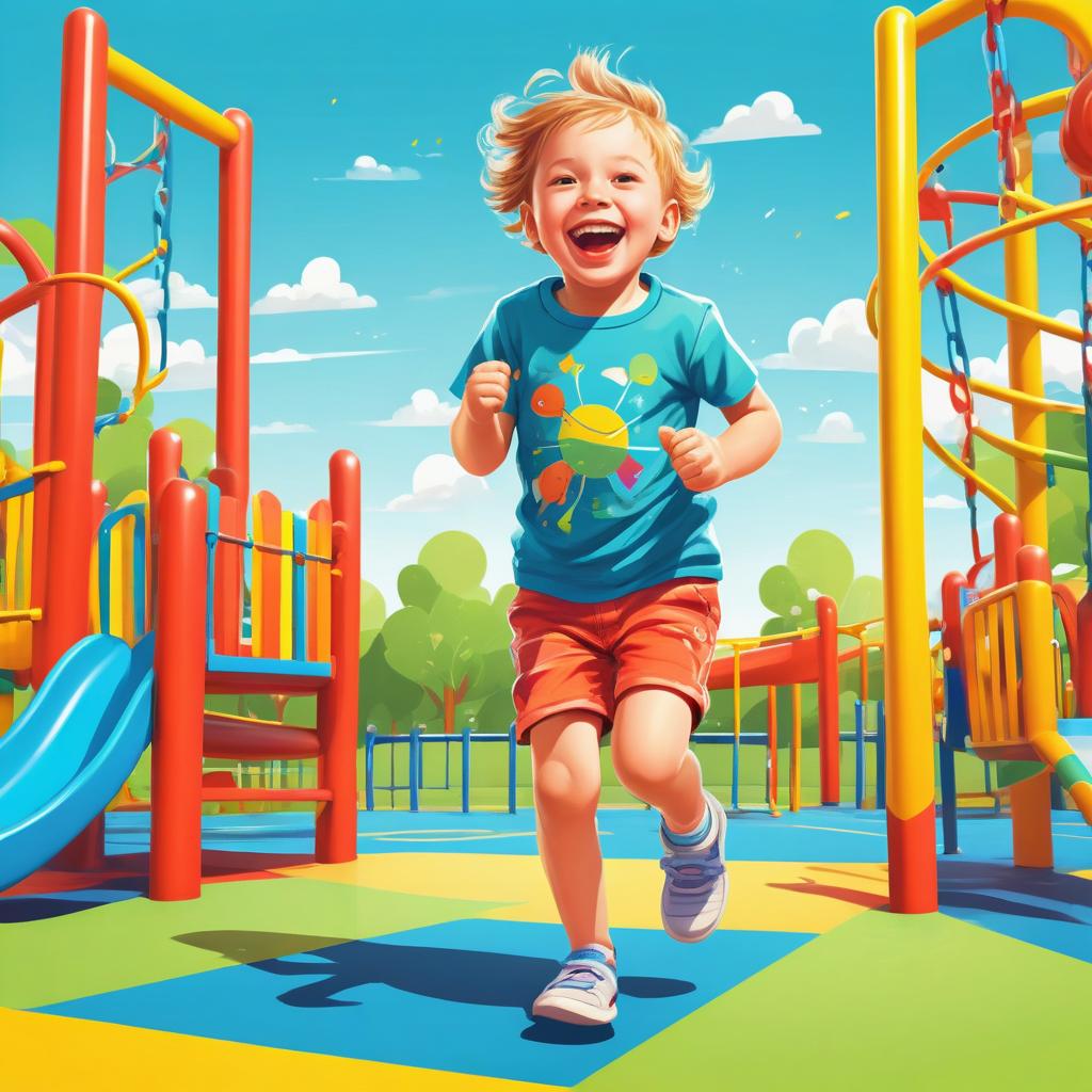 Dynamic illustration of a joyful child, in a colorful t-shirt and shorts, with a sunny playground.