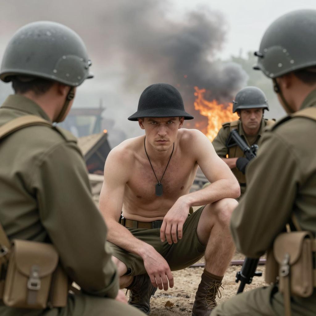 Shirtless Soldier Amid Battlefield Smoke