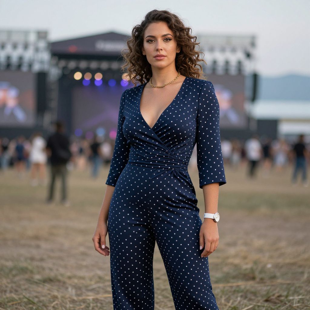 A woman, contemporary chic, navy blue polka dot jumpsuit, V-neck, three-quarter sleeves, peplum waist, wide-leg trousers, gold necklace, stud earrings, wristwatch, natural curls, outdoor music festival, silky water effect, long exposure, serene landscape Sexy. Pretty face and beаutiful eyes. Big breasts