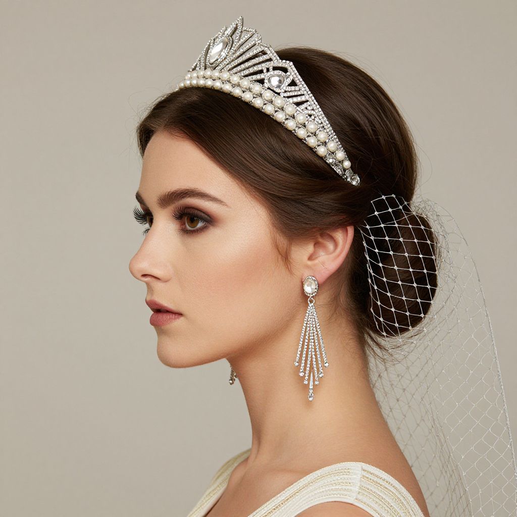 Elegant profile of a woman wearing a sparkling silver Art Deco headband adorned with crystal pearls, complemented by a delicate birdcage veil and matching dangling earrings, showcasing vintage Great Gatsby-inspired bridal accessories against a soft, neutral background.