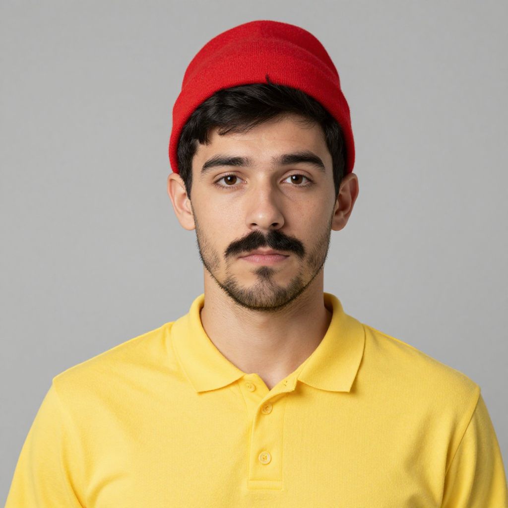 "ootd man costume, 1boy, male focus, solo, hat, standing, facial hair, looking at viewer, full body, mustache, long sleeves, red headwear, sandals, pants, grey background, yellow pants Realistic photo of casual sexy person with pretty face"