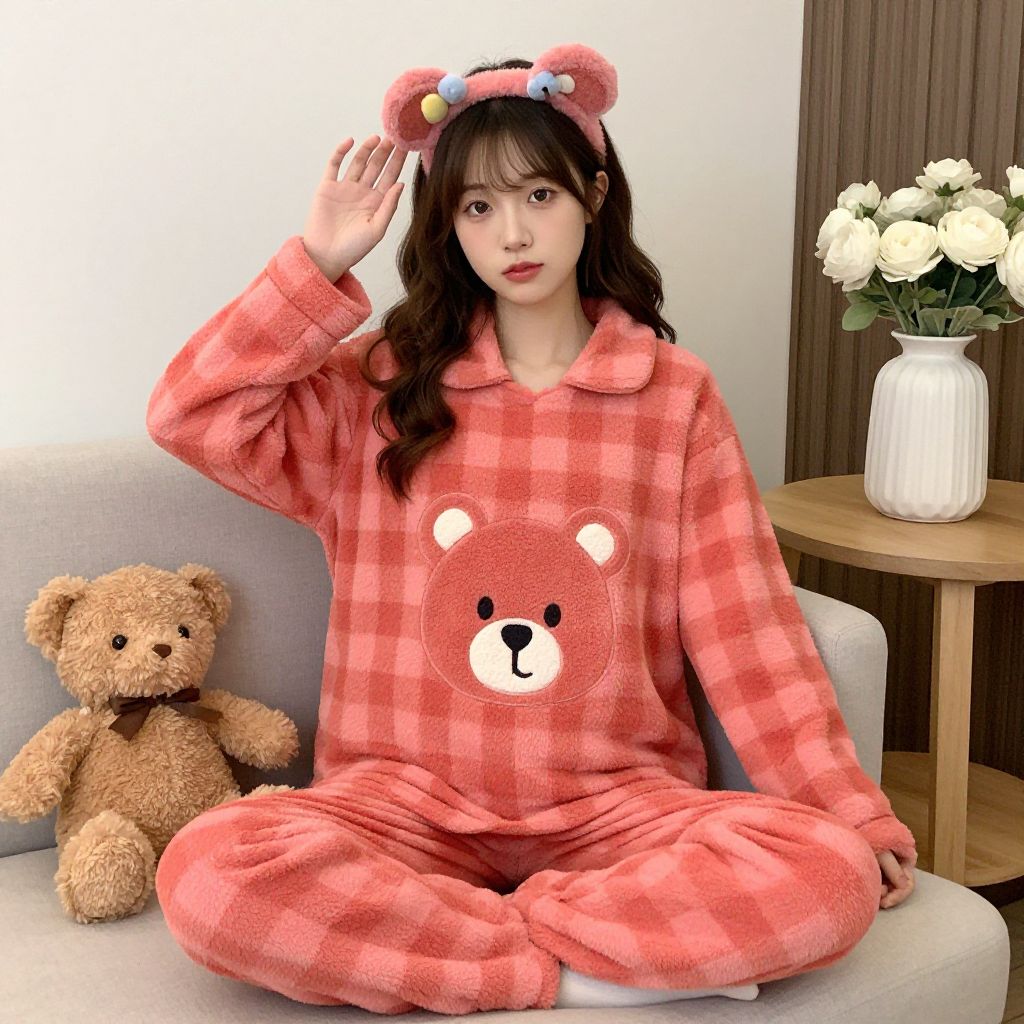 Woman modeling vibrant coral flannel pajamas featuring a playful care bear design, complemented by matching headband ears, seated comfortably in a cozy living room setting with soft lighting, a plush teddy bear, and a decorative vase of white flowers on a wooden side table.