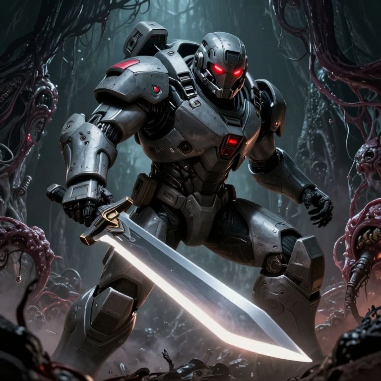 Digital artwork of a glowing red-eyed, silver armored robot wielding a bright sword in a dark, eerie forest with twisted, tentacle-like creatures.