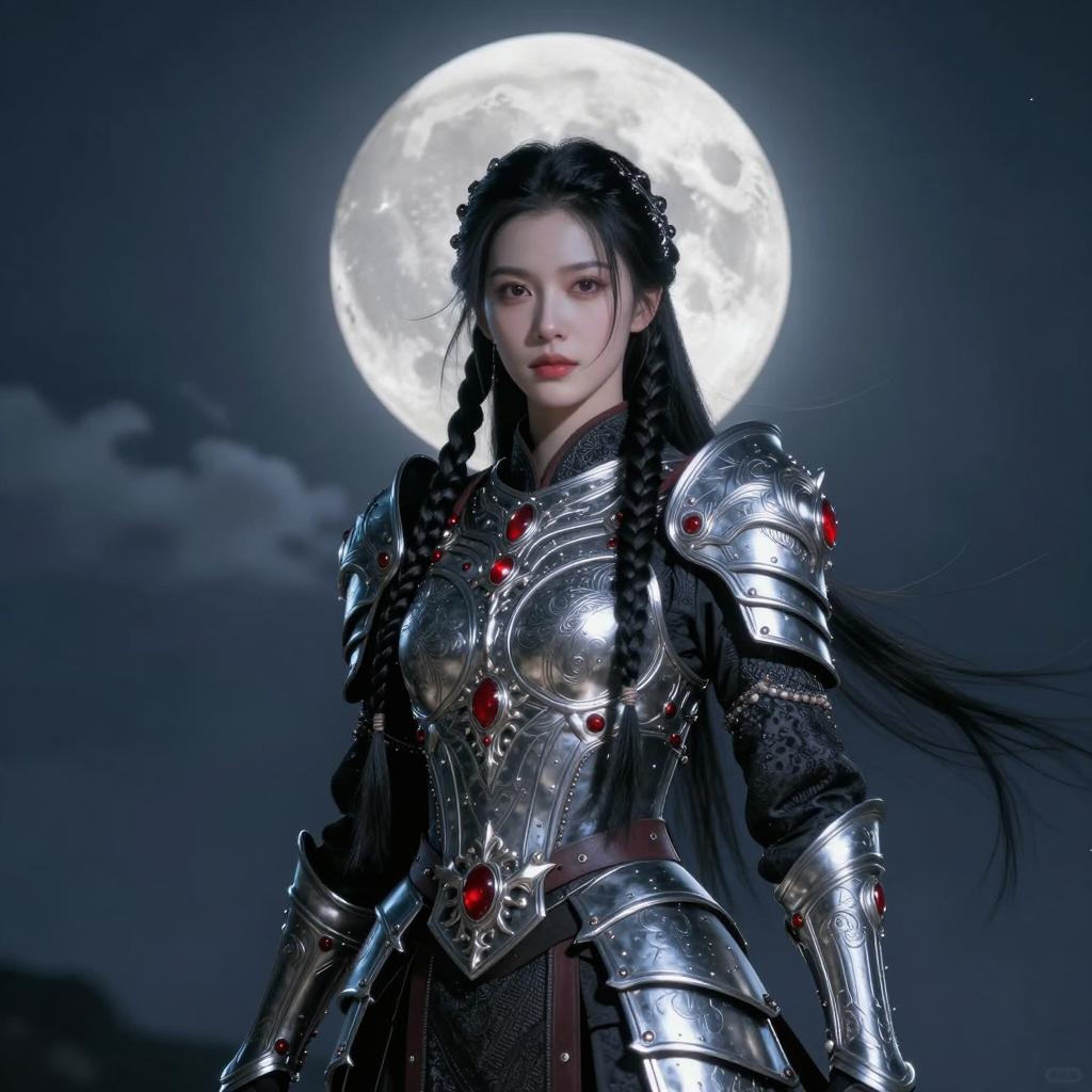 Portrait of a confident young Asian female warrior wearing detailed shiny silver armor with intricate designs. She has a white maid-style apron outfit underneath the armor. She stands in a golden wheat field during sunset, with soft warm natural lighting highlighting her determined expression and the reflective surface of the armor. The background is a blurred rural landscape with brown and beige tones dominating the scene.