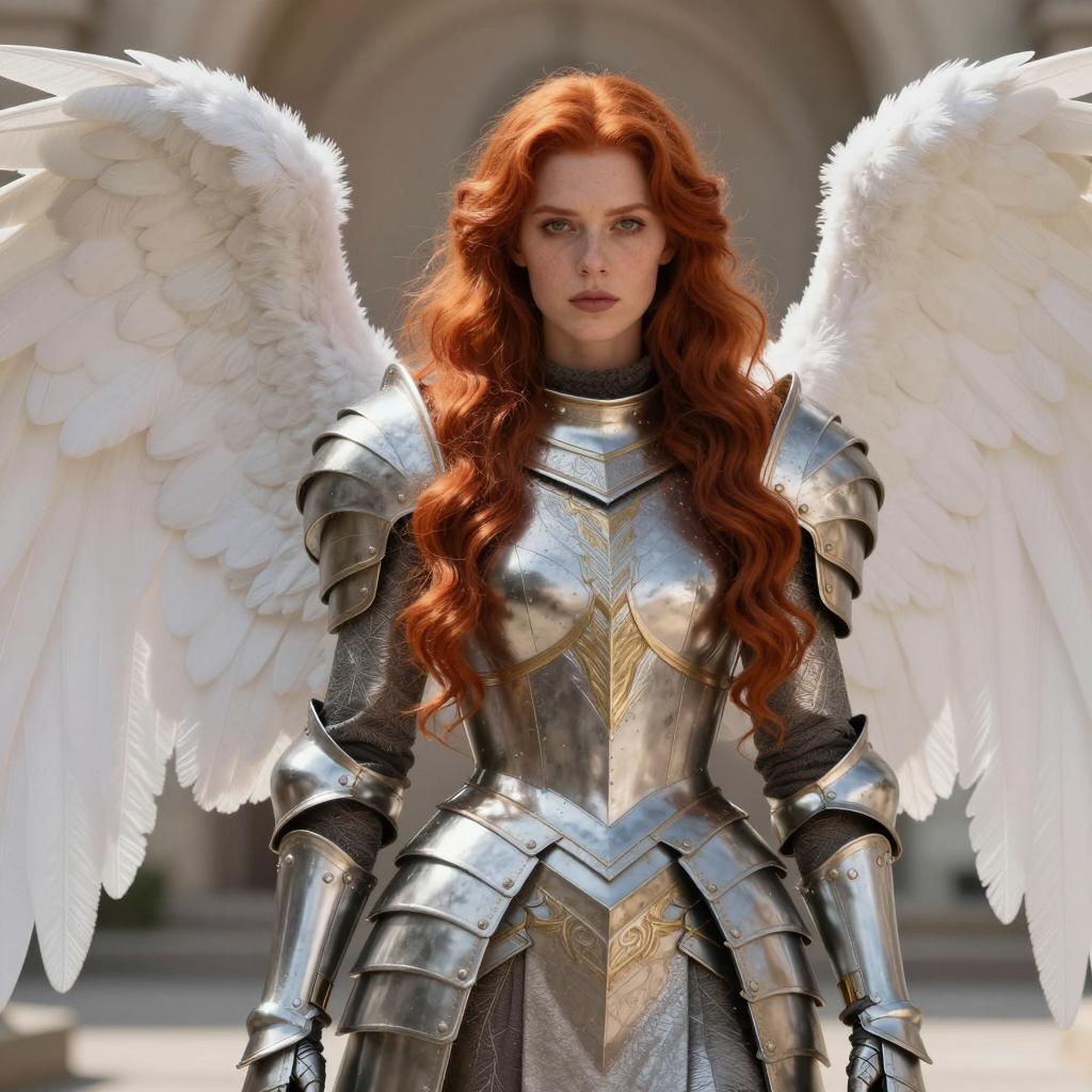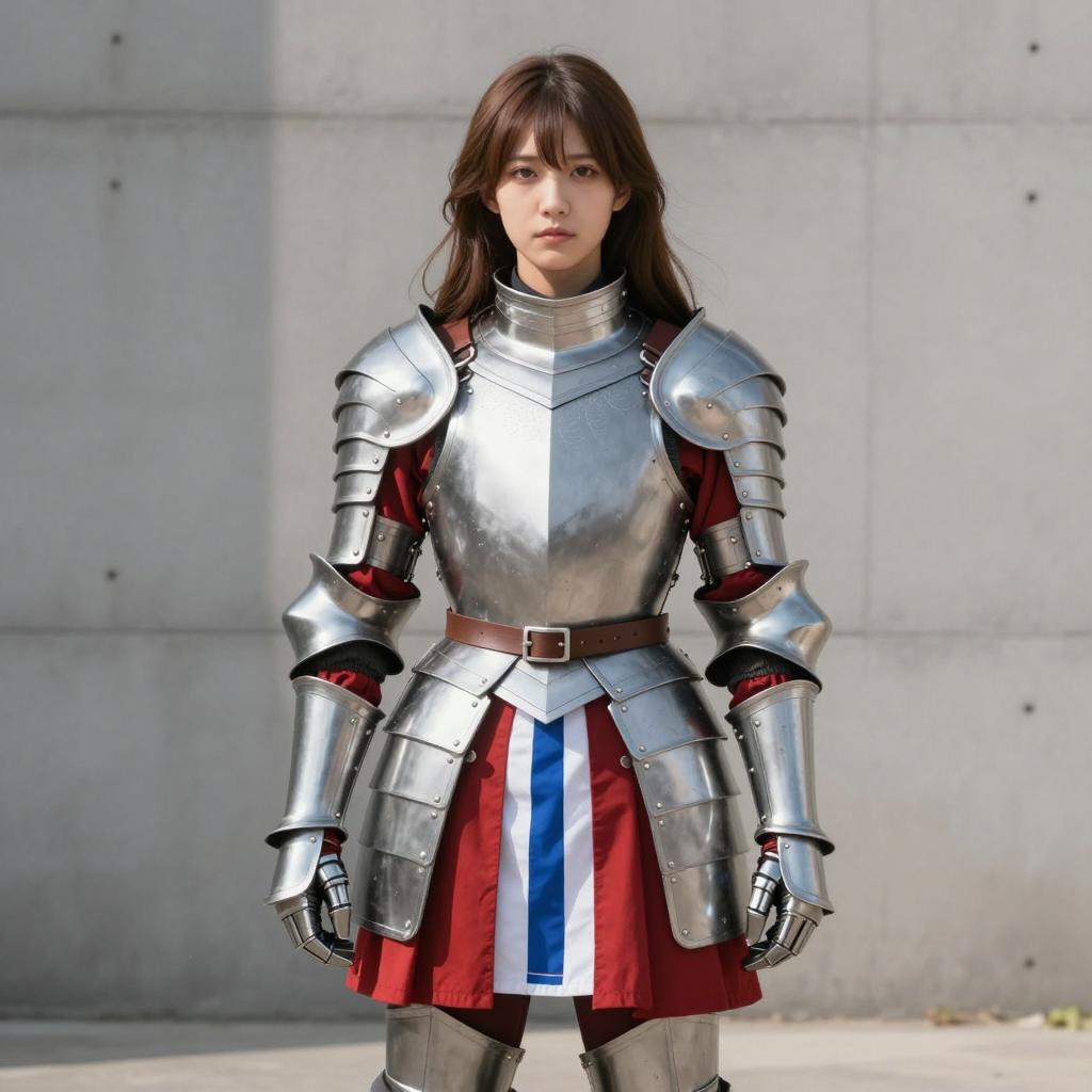 A confident female warrior in detailed shiny silver armor with intricate designs, wearing a white maid-style outfit underneath the armor, standing in a golden wheat field during sunset, soft warm lighting highlighting her determined expression and the reflective surface of the armor, realistic painting style, natural colors with brown and beige tones dominating the scene