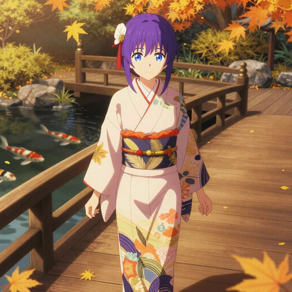 Anime girl with purple hair and blue eyes wearing a traditional kimono with intricate patterns, standing on a wooden bridge over a koi pond, autumn leaves falling around her, warm golden lighting, beautifully detailed environment with a calm, peaceful vibe