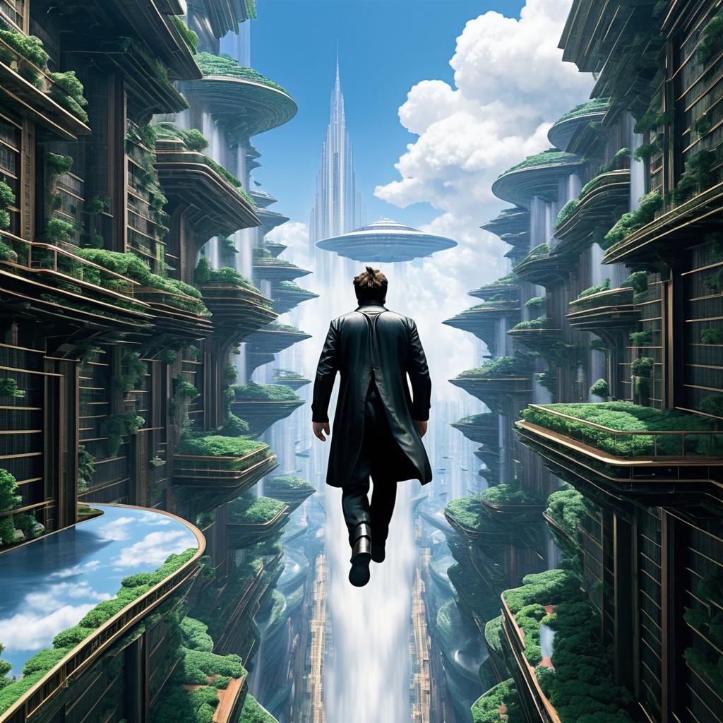 A man in a black suit walking between futuristic floating city structures above a sprawling metropolis with tall skyscrapers under a blue sky with clouds. The image depicts a surreal sci-fi scene with advanced urban architecture and innovation.