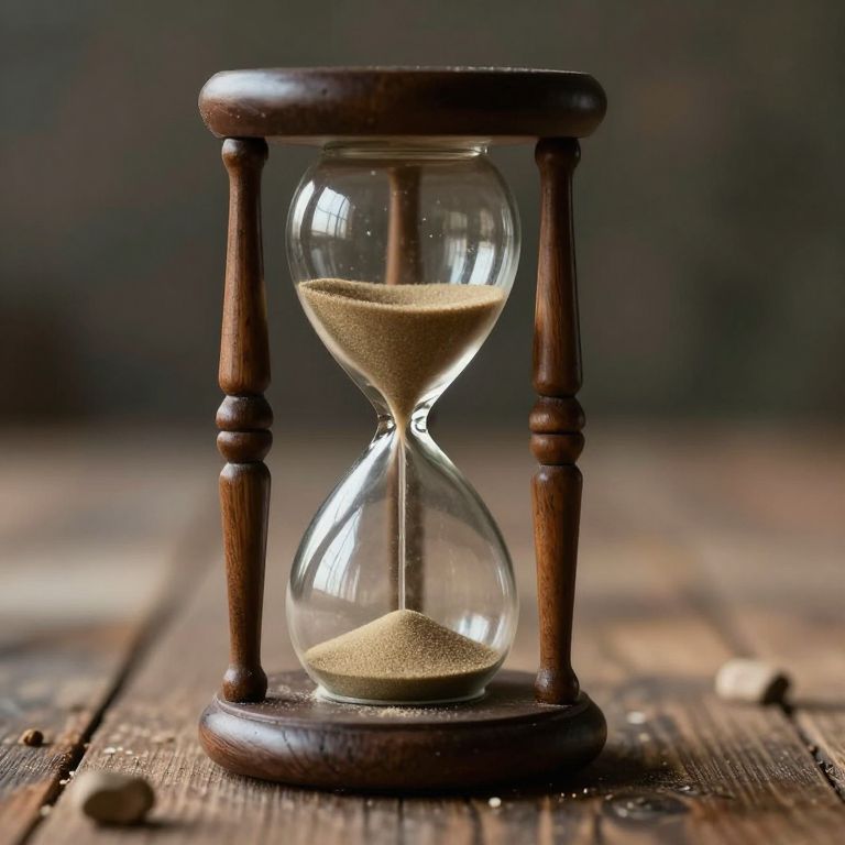 Photograph of an antique wooden hourglass with sand, centered on a rustic wooden table, against a dark, blurred background.