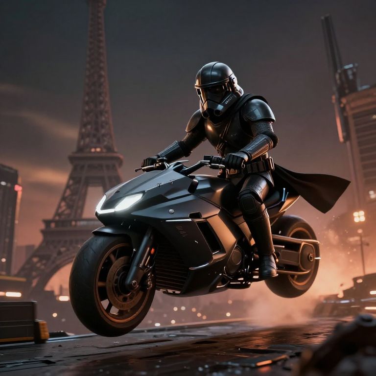 3D Illustration a starwars dark clone on a levitating speeder-bike, in postapocalyptic town, paris eiffel tower, dramatic, cinematic ambience, dark, Octane render, Volumetric warm light,