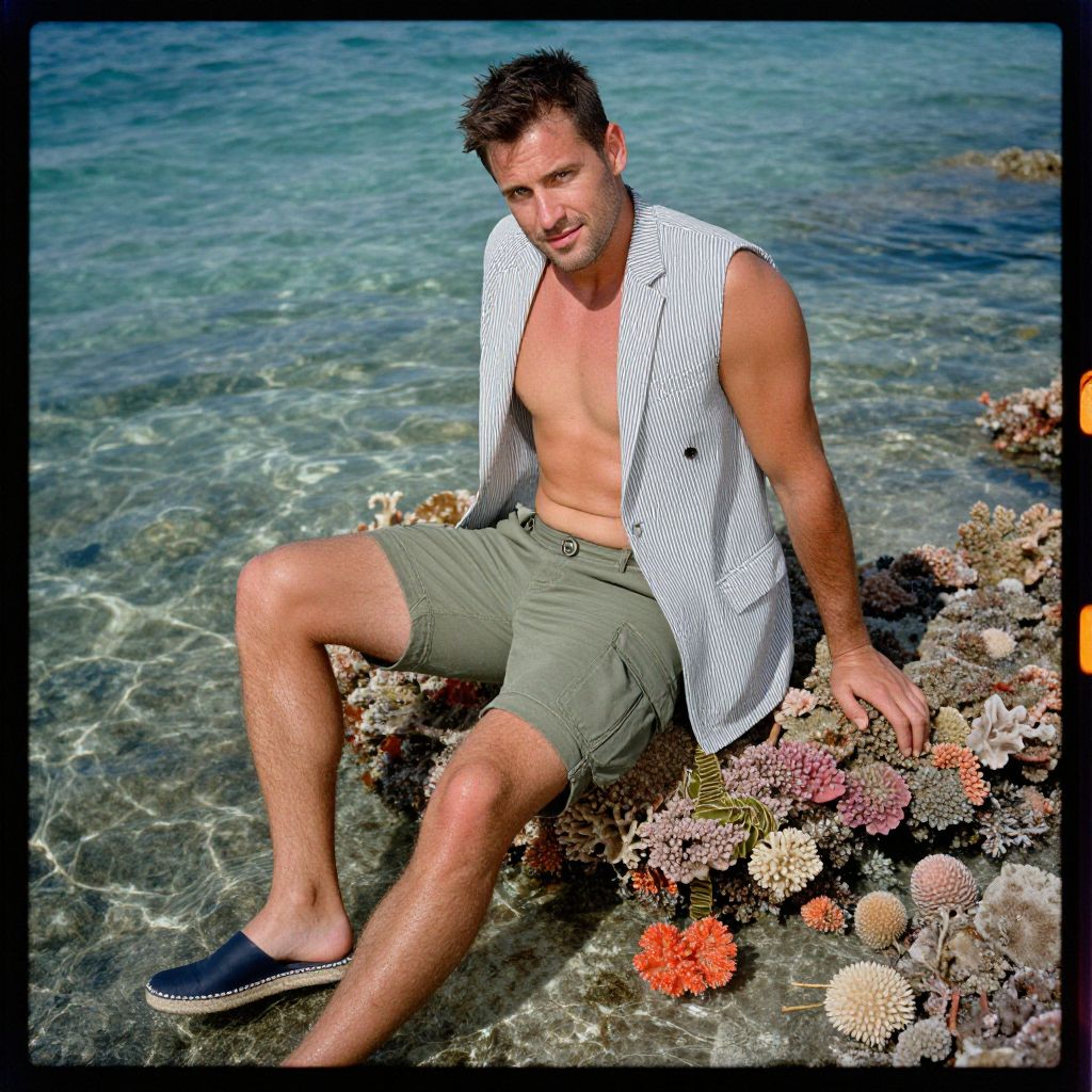 A man, striped seersucker sleeveless beach blazer, olive green cargo shorts, navy espadrilles, colorful coral reefs, crystal-clear waters, daguerreotype film, relaxed smile, sun-kissed skin. Man has masculine face and piercing eyes