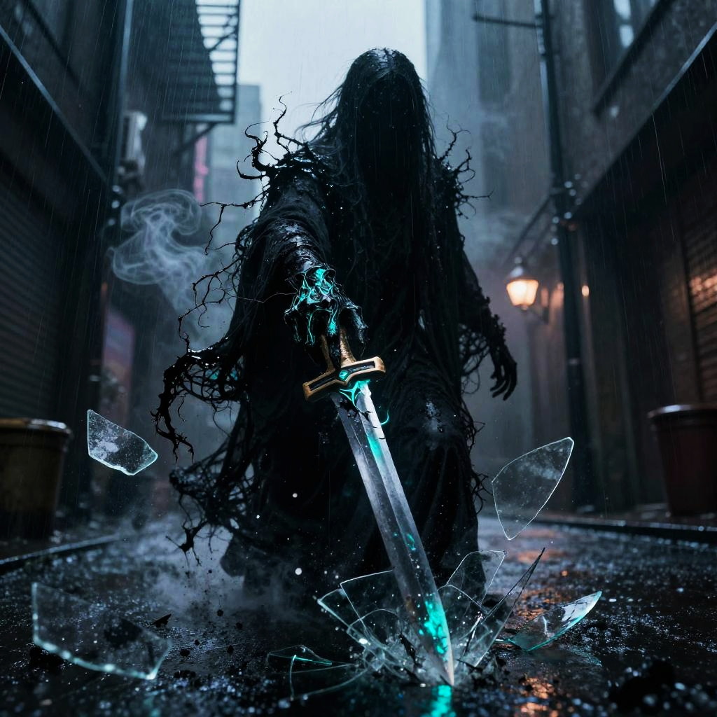 A spectral wraith with obsidian blade-like fingers veined with flickering cyan light reaching forward, its form dissolving into wake of shattered glass and ink-slick smoke, moving through a neon rain-soaked alley beneath an acid sky.