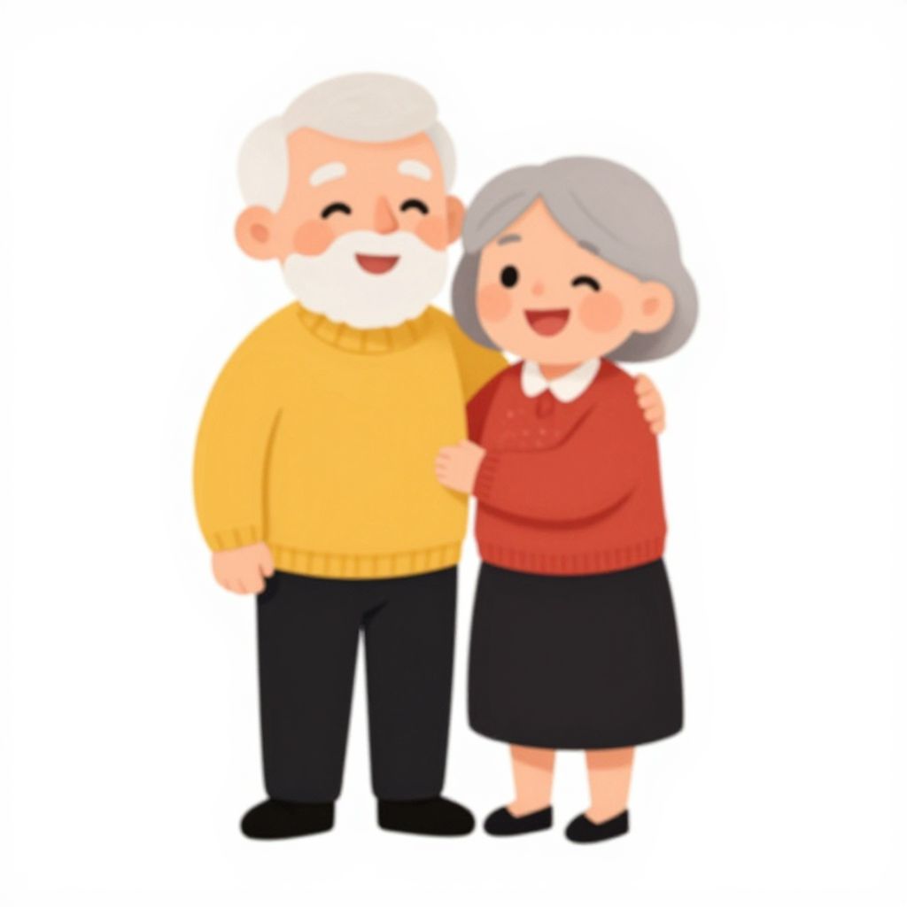 Cheerful cartoon illustration of a happy senior couple standing side by side, with the man wearing a yellow sweater and black pants, and the woman dressed in a red sweater and black skirt, both smiling warmly and embracing each other.