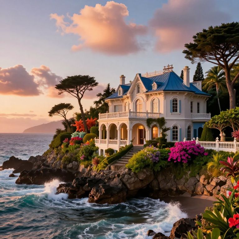 Photograph of a grand, white Victorian-style mansion with a blue roof, set on a rocky coastal cliff. The mansion features arched windows, a balcony, and ornate details. Bright pink bougainvillaea and lush greenery surround the building, which is illuminated by warm, golden sunset light. Waves crash against the rocks below, and the horizon shows a pink and orange sky with scattered clouds. Tall, dark trees frame the house, adding to the picturesque, tropical setting. The image has vibrant colors and a slightly surreal, hyper-realistic style.