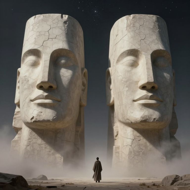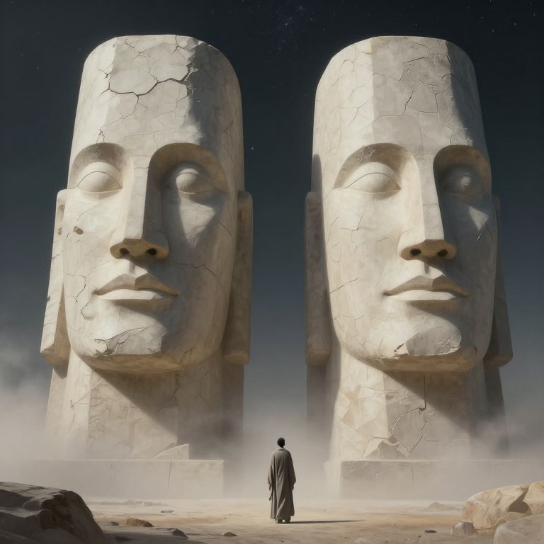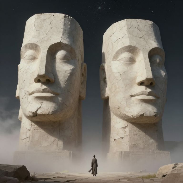 Photorealistic digital artwork depicts a desolate, nighttime landscape with two massive, cracked stone Moai heads standing side-by-side against a dark, starry sky. The Moai heads, with serene, closed eyes and prominent, smooth noses, dominate the scene, their surfaces textured with large, visible cracks. A solitary figure, dressed in a long, dark robe, stands in the foreground, facing the Moai heads. A misty haze surrounds the base of the statues, adding a mysterious atmosphere. The ground is rocky and barren, with a few small rocks scattered around. The image evokes a sense of ancient mystery and isolation.
