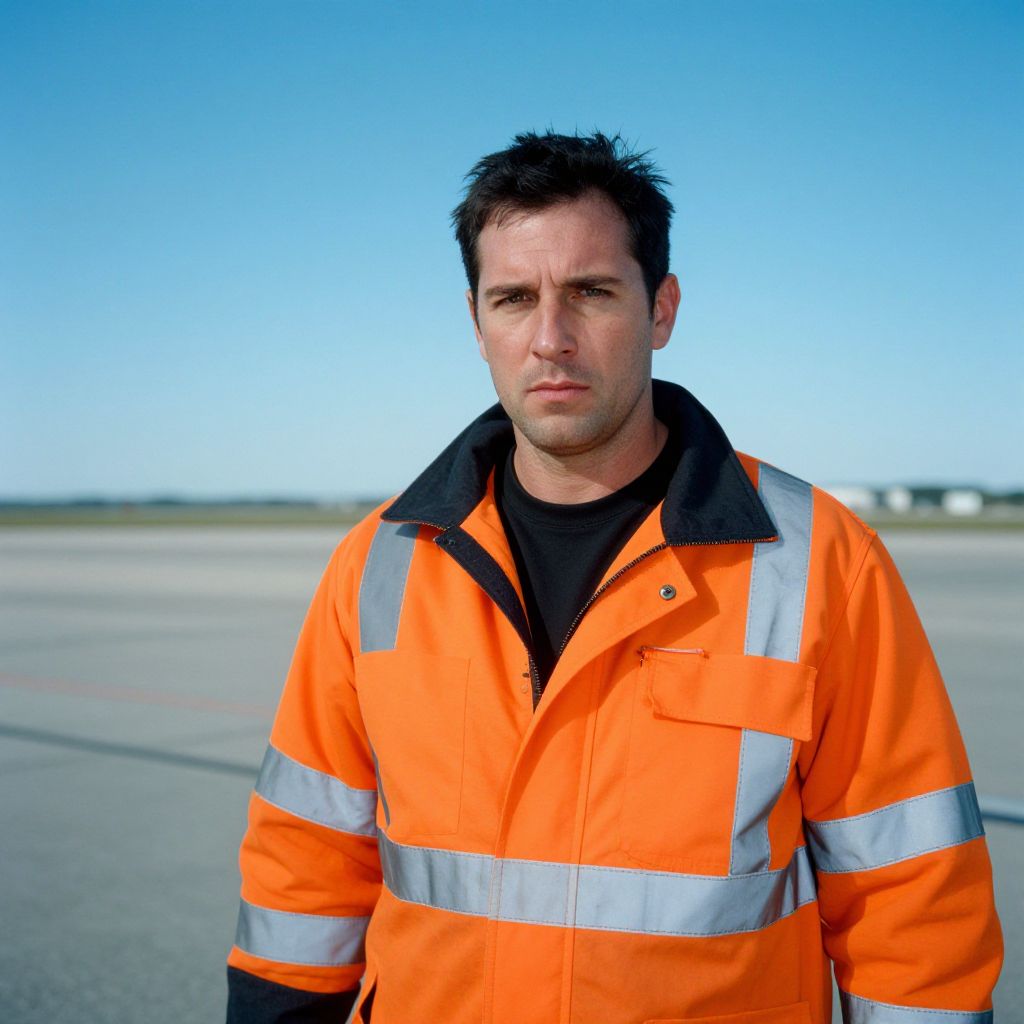 Photograph of a serious-looking man with short black hair, wearing an orange high-visibility jacket with silver stripes, standing on an empty, sunny airport