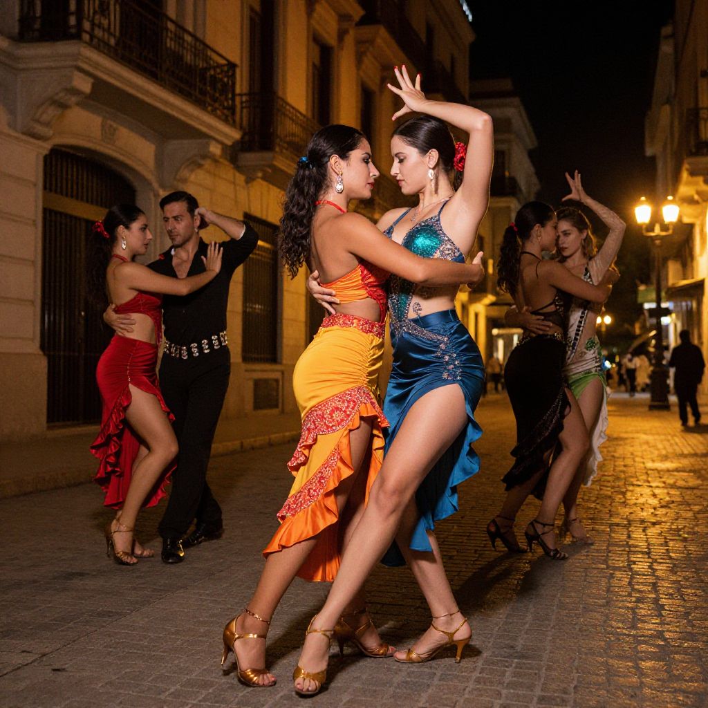 Sexy Argentine women dressed in vibrant tango outfits, dancing passionately on a dimly lit Buenos Aires street, with warm golden lights and classic architecture in the background.