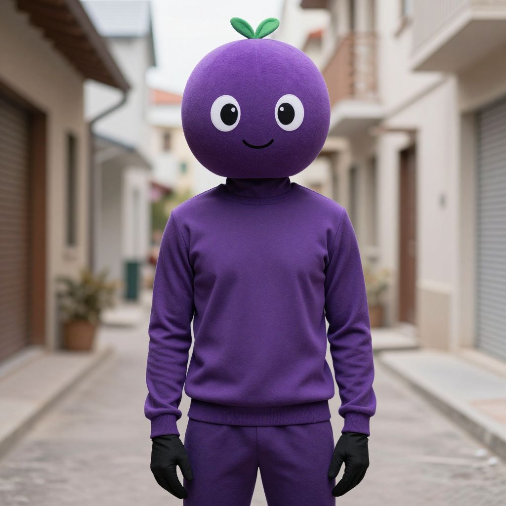 Photograph of a person standing in a narrow, urban alleyway. They wear a purple, full-body, cartoonish mask resembling a round fruit with large, white eyes and a small smile, topped with a green leaf. The person is dressed in a matching purple sweatshirt and pants, with black gloves. The alley features blurred, beige and brown buildings with closed shutters on either side, and a potted plant in the background. The image has a surreal, slightly digital, cartoonish feel due to the mask. The street is paved and slightly worn.