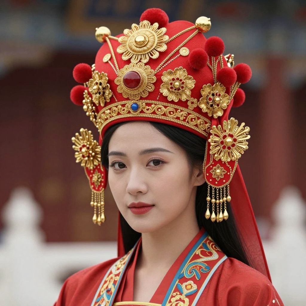 Photograph of an Asian woman with fair skin, black hair, and red lipstick, wearing an ornate, red, gold-embellished crown adorned with red pom-poms and intricate gold floral designs. She dons a red traditional dress with blue and gold trim. The background is blurred, featuring a red and blue patterned structure, suggesting a traditional Asian setting. Her expression is calm and composed, with a slight smile. The image focuses on her upper body, highlighting the detailed craftsmanship of her regal attire.