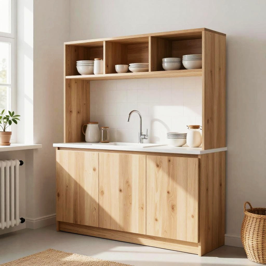 Oberschrank in Scandinavian style kitchen, light pine wood with simple design, white backsplash, bright natural daylight, minimalist open shelving nearby with neatly arranged crockery, calm and airy space emphasizing functionality