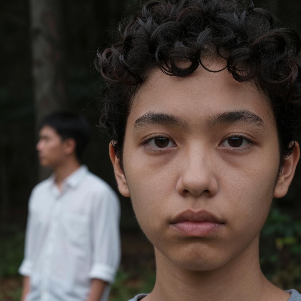 Close-up photograph of a young woman's face with short, curly dark hair, brown eyes, and neutral expression. In the background, a man in a white shirt stands near a tree in a dark forest, looking away. Two people, woman's face in foreground, man in background.