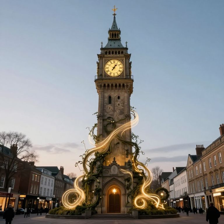 A colossal clock tower stands serenely amidst a historic town square, its golden face frozen in time, while ethereal, writhing vines of light twist and loop around it like a living, paradoxical sculpture, defying gravity and reason as they weave an otherworldly tapestry against the sky.