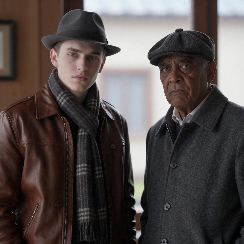 Photograph of two men standing indoors. Young man with fair skin, gray fedora, brown leather jacket, and plaid scarf. Older man with olive skin, gray flat cap, gray wool coat. Both have serious expressions. Background shows a window with blurred outdoor scene. Wooden interior elements on the left.