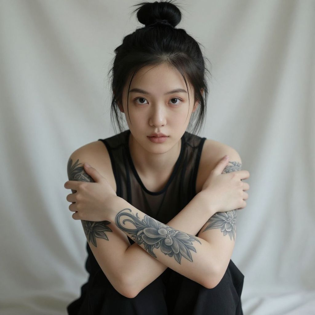 Photograph of a young Asian woman with fair skin and dark hair in a top knot. She's sitting, arms crossed over her chest, showing off extensive black and grey tattoos on her arms. She's wearing a black, semi-sheer top and has a neutral expression. The background is a soft, white fabric, adding a calm contrast to her detailed ink work.