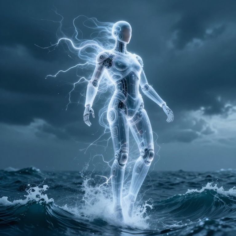 A surreal suit prompts vision of a humanoid figure in a floating, transparent cybernetic suit drifting above a stormy ocean, electric waves pulsing around it, dynamic lighting, abstract shapes, futuristic fusion of biotech and nature, high detail, Dall-E style.