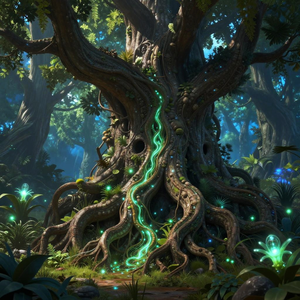 Innards of a giant ancient tree revealed, showing twisting roots, glowing sap flowing through veins like arteries, mystical forest ambiance, bioluminescent plants surrounding it, highly detailed fantasy art with vibrant greens and blues.