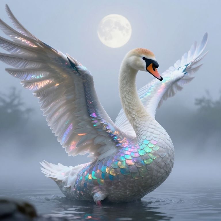Digital artwork of a majestic, white swan with glowing, iridescent feathers spreading wings in a moonlit, enchanted forest, surrounded by twinkling
